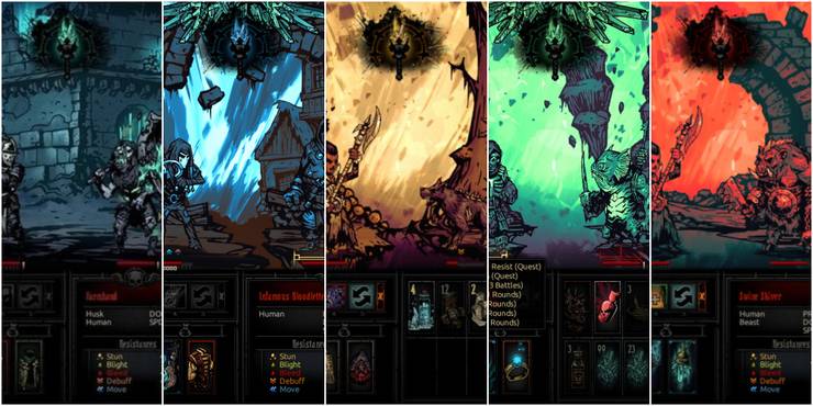 The next batch is trickier. Blazing blue increases damage against Marked targets, Debuff Skill chance, and enemies’ Speed and Protection stats. The Haunting green increases Blight Skill chance for all parties, adds +10 to the enemy’s dodge, and increases your Stress. The Gleaming red increases Bleed chance for all, and the usefulness of your healing skills, but adds a higher crit-chance for monsters.